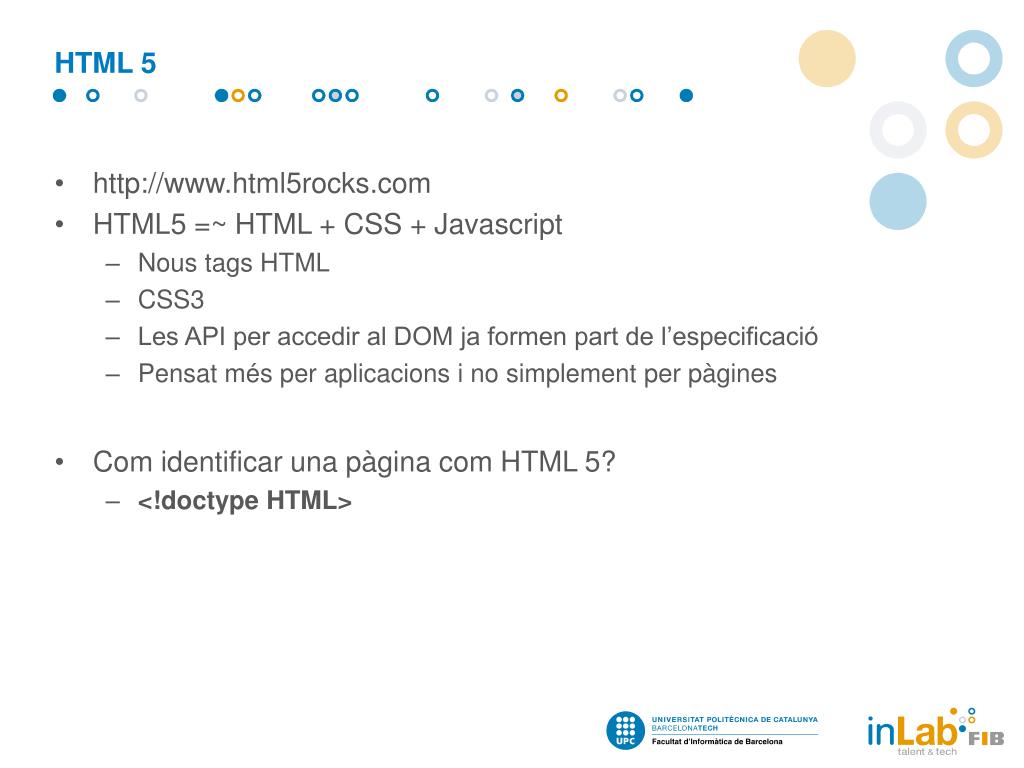 HTML 5 • http://www.html5rocks.com • HTML5 =~ HTML + CSS + Javascript • Nous tags HTML • CSS3 • Les API per accedir al DOM ja formen part de l’especificació • Pensat més per aplicacions i no simplement per pàgines • Com identificar una pàgina com HTML 5? • <!doctype HTML>
