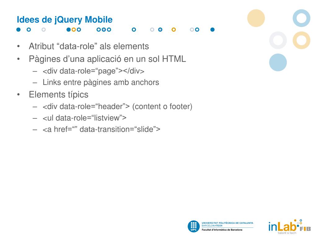 Idees de jQuery Mobile • Atribut “data-role” alselements • Pàginesd’unaaplicació en un sol HTML • <div data-role=“page”></div> • Links entre pàginesambanchors • Elementstípics • <div data-role=“header”> (content o footer) • <ul data-role=“listview”> • <a href=“” data-transition=“slide”>