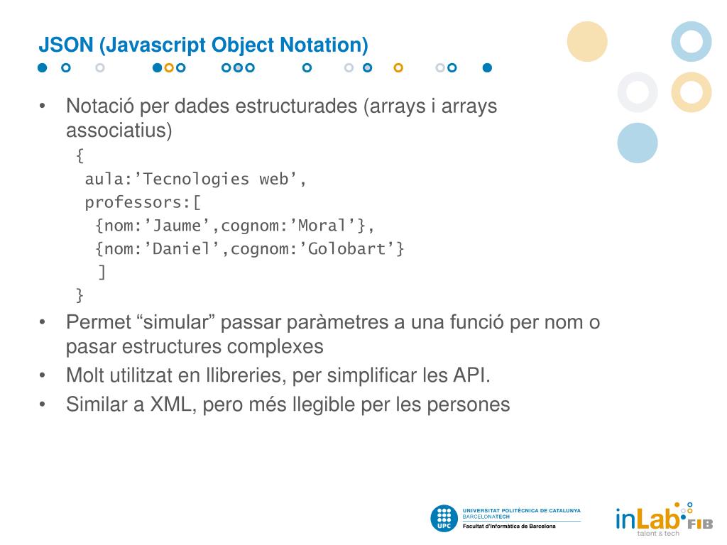 JSON (Javascript Object Notation) • Notació per dades estructurades (arrays i arrays associatius) { aula:’Tecnologies web’, professors:[ {nom:’Jaume’,cognom:’Moral’}, {nom:’Daniel’,cognom:’Golobart’} ] } • Permet “simular” passar paràmetres a una funció per nom o pasar estructures complexes • Molt utilitzat en llibreries, per simplificar les API. • Similar a XML, pero més llegible per les persones
