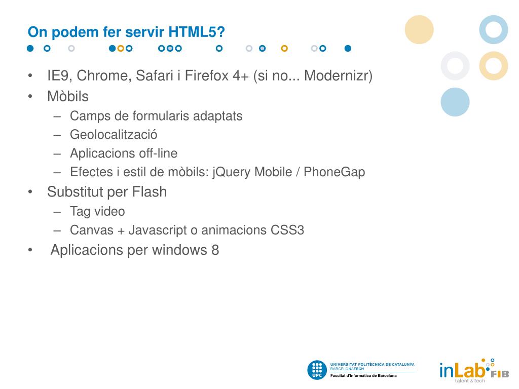 On podem fer servir HTML5? • IE9, Chrome, Safari i Firefox 4+ (si no... Modernizr) • Mòbils • Camps de formularis adaptats • Geolocalització • Aplicacions off-line • Efectes i estil de mòbils: jQuery Mobile / PhoneGap • Substitut per Flash • Tag video • Canvas + Javascript o animacions CSS3 • Aplicacions per windows 8