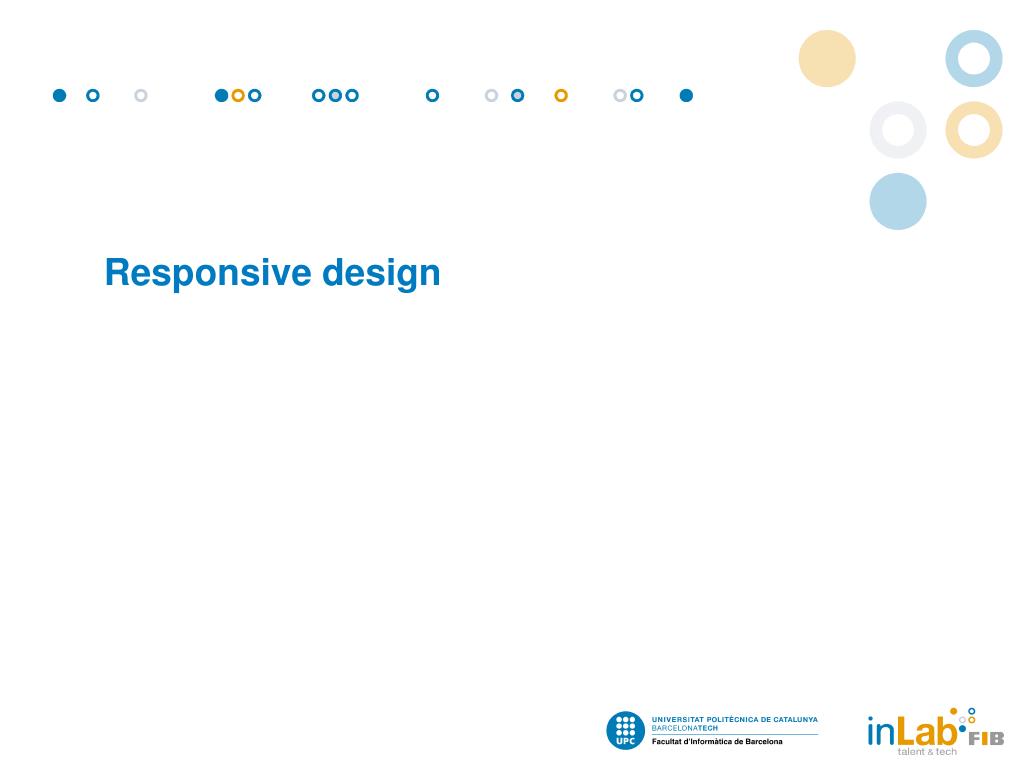 Idea del responsivedesign • Consultem la resolució • Fem CSS adaptats a la resolució • Líquid, fixe o una barrejadepenent de la mida • Aixoenspermet • Canviar mides segons la resolució • Amagar elements • Recolocar elements • Volem una única versió del web!