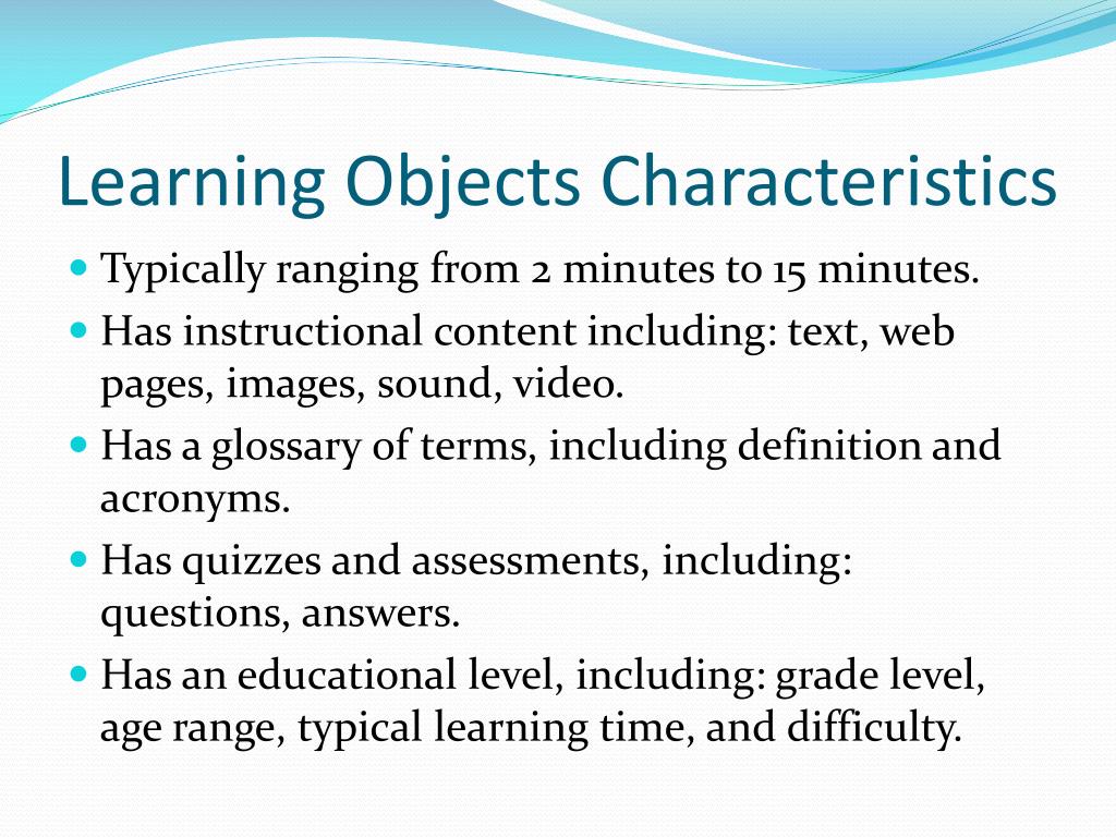 Learning Objects Characteristics • Typically ranging from 2 minutes to 15 minutes. • Has instructional content including: text, web pages, images, sound, video. • Has a glossary of terms, including definition and acronyms. • Has quizzes and assessments, including: questions, answers. • Has an educational level, including: grade level, age range, typical learning time, and difficulty.