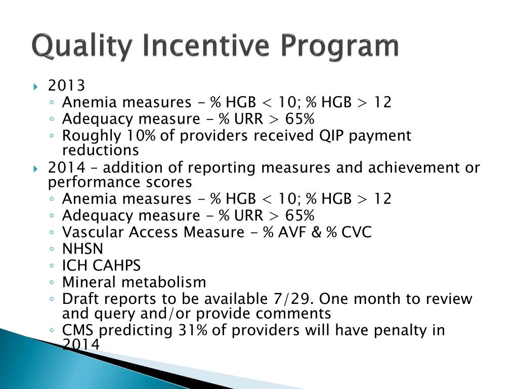 Quality Incentive Program • 2013 • Anemia measures - % HGB < 10; % HGB > 12 • Adequacy measure - % URR > 65% • Roughly 10% of providers received QIP payment reductions • 2014 – addition of reporting measures and achievement or performance scores • Anemia measures - % HGB < 10; % HGB > 12 • Adequacy measure - % URR > 65% • Vascular Access Measure - % AVF & % CVC • NHSN • ICH CAHPS • Mineral metabolism • Draft reports to be available 7/29. One month to review and query and/or provide comments • CMS predicting 31% of providers will have penalty in 2014