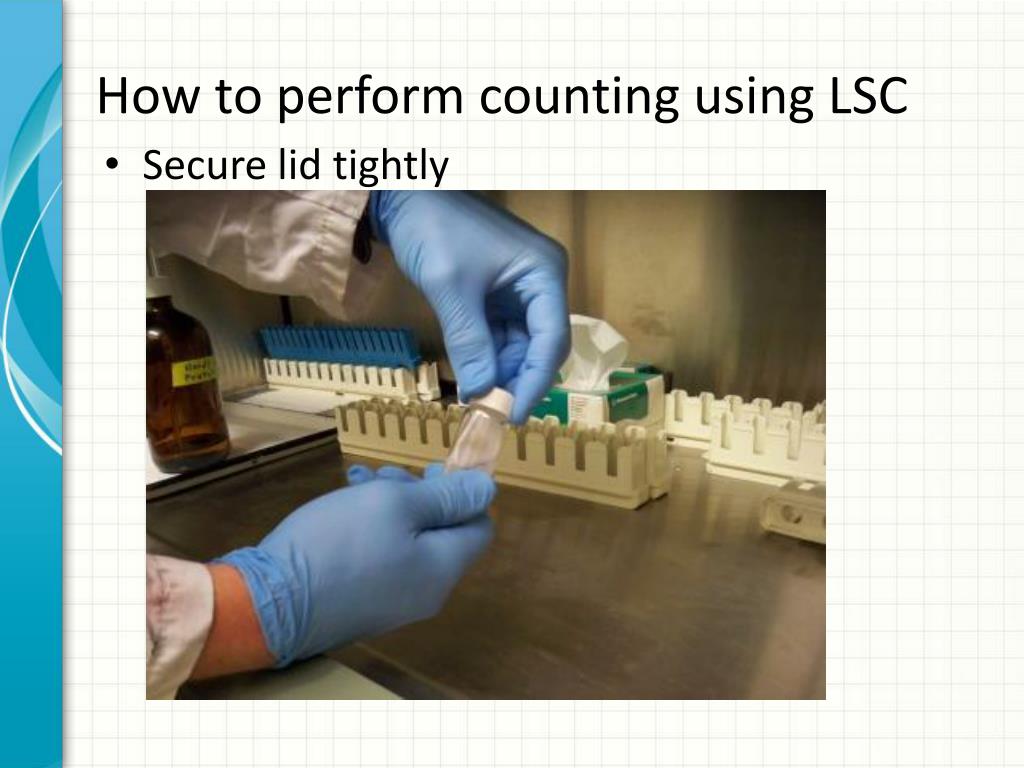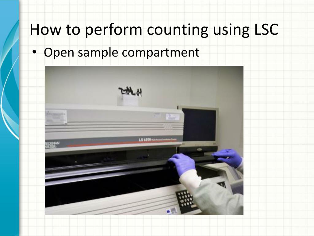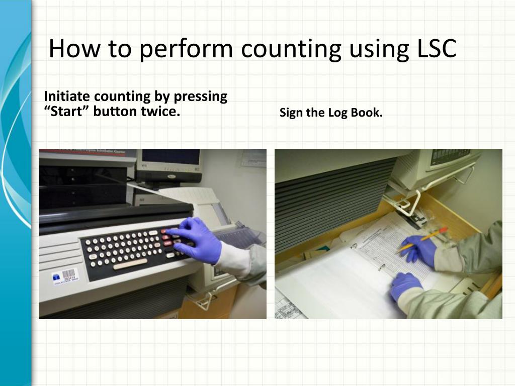 How to perform counting using LSC Initiate counting by pressing “Start” button twice. Sign the Log Book.