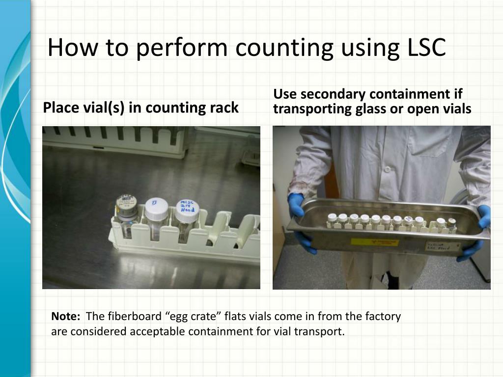 How to perform counting using LSC Place vial(s) in counting rack Use secondary containment if transporting glass or open vials Note: The fiberboard “egg crate” flats vials come in from the factory are considered acceptable containment for vial transport.