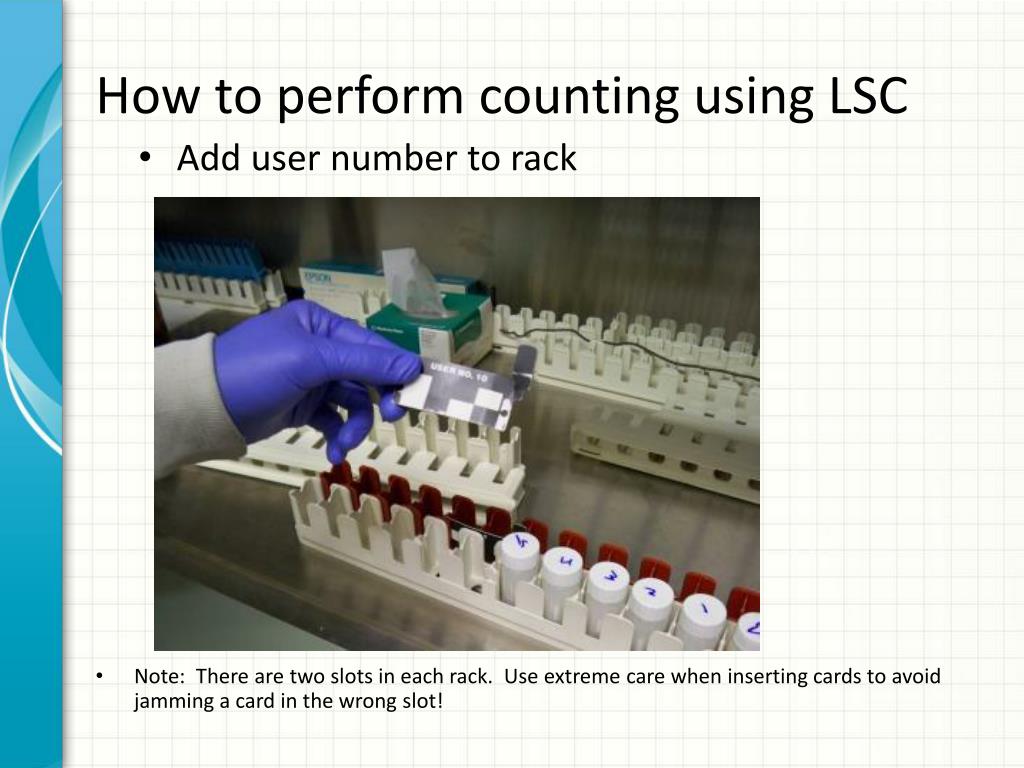 Add user number to rack How to perform counting using LSC • Note: There are two slots in each rack. Use extreme care when inserting cards to avoid jamming a card in the wrong slot!