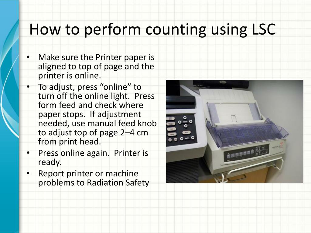 How to perform counting using LSC • Make sure the Printer paper is aligned to top of page and the printer is online. • To adjust, press “online” to turn off the online light. Press form feed and check where paper stops. If adjustment needed, use manual feed knob to adjust top of page 2–4 cm from print head. • Press online again. Printer is ready. • Report printer or machine problems to Radiation Safety