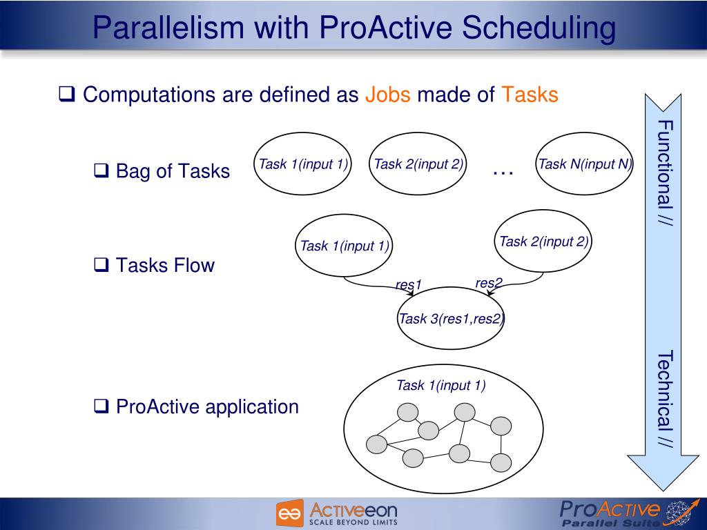 Parallelism with ProActive Scheduling • Computations are defined as Jobs made of Tasks • Bag of Tasks • Tasks Flow • ProActive application Task 2(input 2) Task 1(input 1) Task 1(input 1) res2 res1 Task 3(res1,res2) Functional // Technical // Task 1(input 1) Task 2(input 2) Task N(input N) …