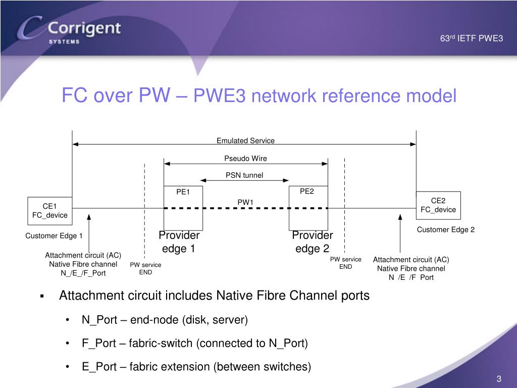FC over PW – PWE3 network reference model • Attachment circuit includes Native Fibre Channel ports • N_Port – end-node (disk, server) • F_Port – fabric-switch (connected to N_Port) • E_Port – fabric extension (between switches)