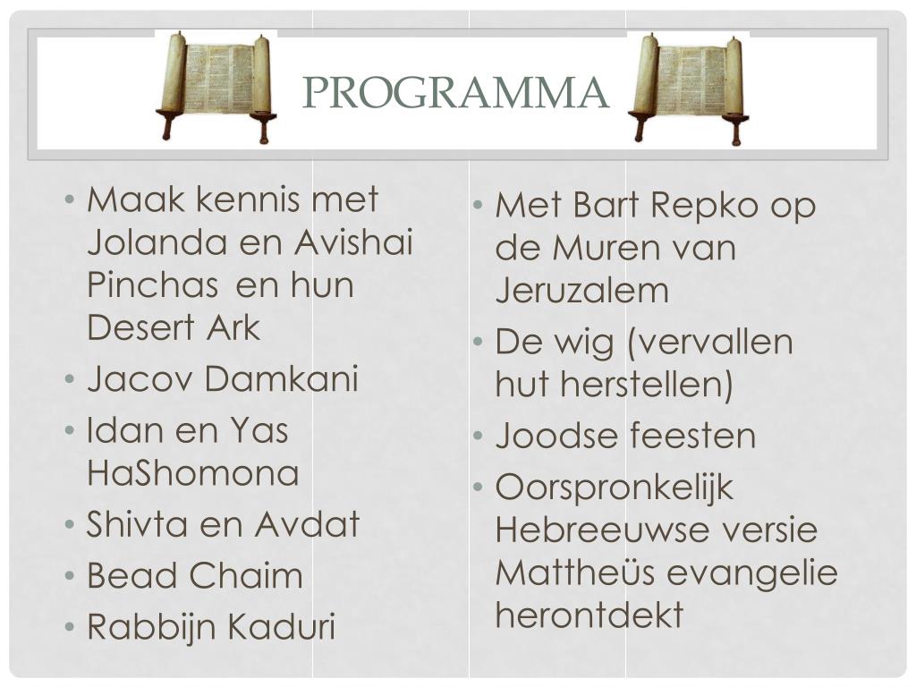 Programma • Maak kennis met Jolanda en Avishai Pinchas en hun Desert Ark • Jacov Damkani • Idan en Yas HaShomona • Shivta en Avdat • Bead Chaim • Rabbijn Kaduri • Met Bart Repko op de Muren van Jeruzalem • De wig (vervallen hut herstellen) • Joodse feesten • Oorspronkelijk Hebreeuwse versie Mattheüs evangelie herontdekt