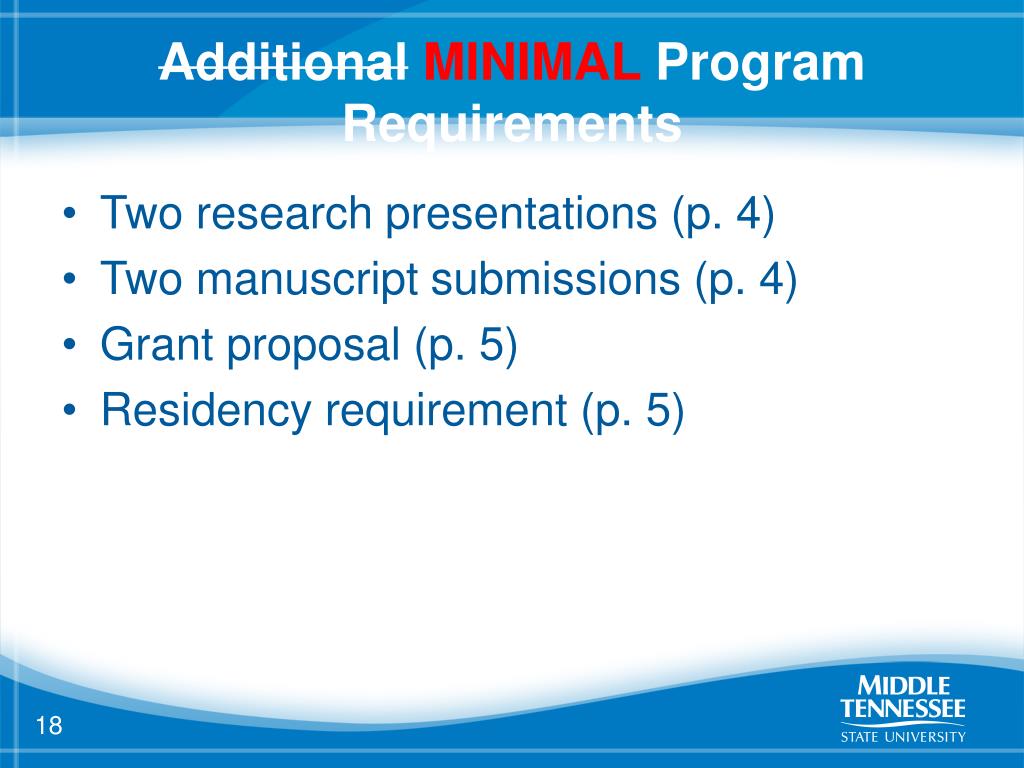 AdditionalMINIMAL Program Requirements • Two research presentations (p. 4) • Two manuscript submissions (p. 4) • Grant proposal (p. 5) • Residency requirement (p. 5)