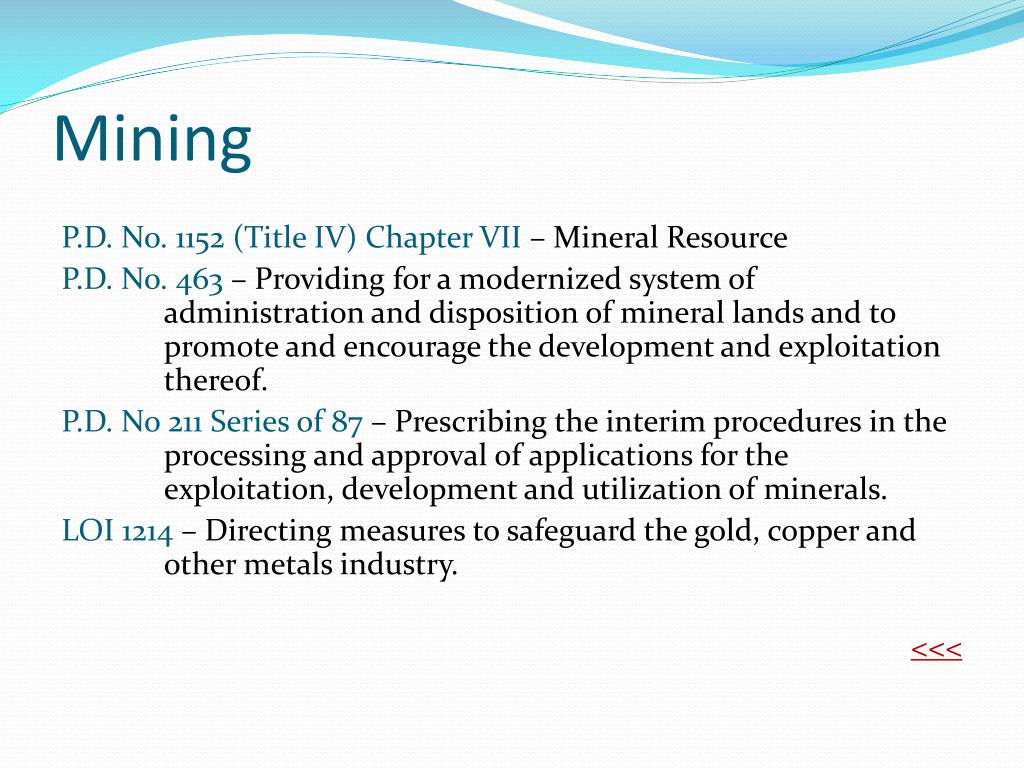 Mining P.D. No. 1152 (Title IV) Chapter VII – Mineral Resource P.D. No. 463 – Providing for a modernized system of administration and disposition of mineral lands and to promote and encourage the development and exploitation thereof. P.D. No 211 Series of 87 – Prescribing the interim procedures in the processing and approval of applications for the exploitation, development and utilization of minerals. LOI 1214 – Directing measures to safeguard the gold, copper and other metals industry. <<<