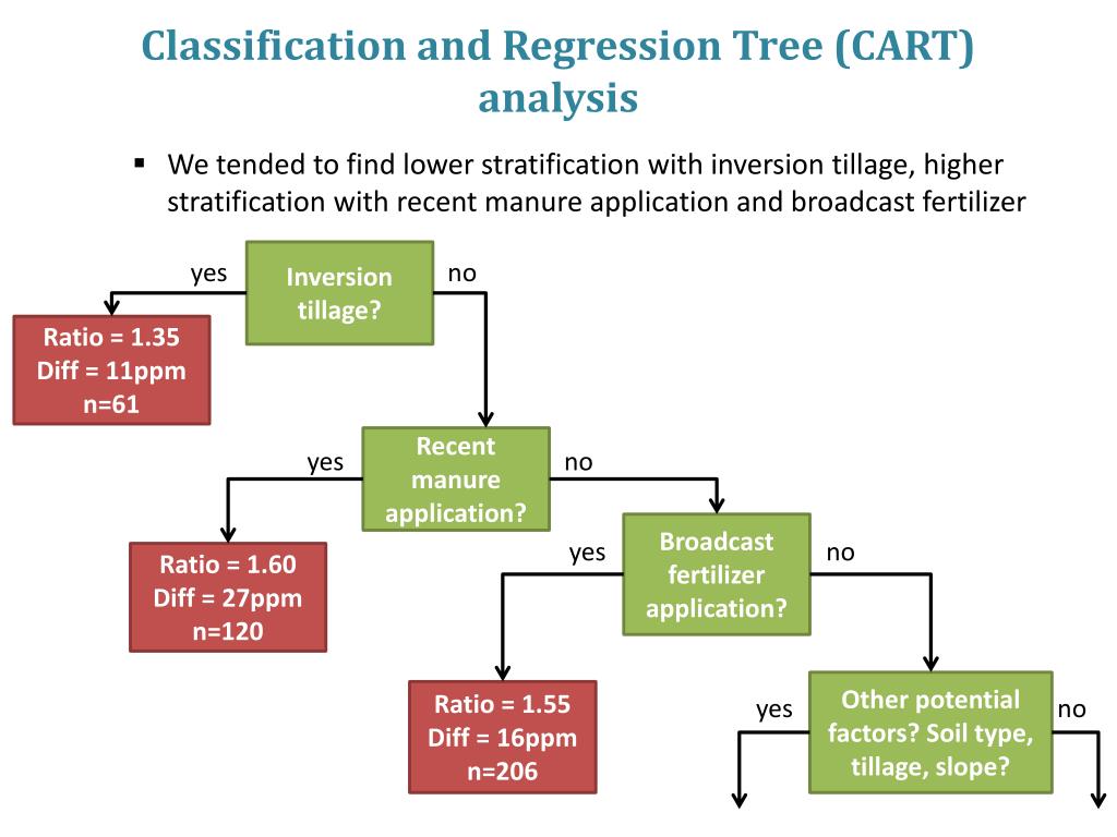 Classification and Regression Tree (CART) analysis • We tended to find lower stratification with inversion tillage, higher stratification with recent manure application and broadcast fertilizer Inversion tillage? yes no Ratio = 1.35 Diff = 11ppm n=61 Recent manure application? yes no Broadcast fertilizer application? yes no Ratio = 1.60 Diff = 27ppm n=120 Other potential factors? Soil type, tillage, slope? Ratio = 1.55 Diff = 16ppm n=206 yes no