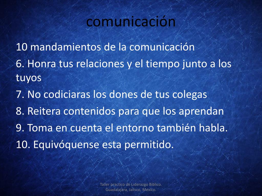 comunicación 10 mandamientos de la comunicación 6. Honra tus relaciones y el tiempo junto a los tuyos 7. No codiciaras los dones de tus colegas 8. Reitera contenidos para que los aprendan 9. Toma en cuenta el entorno también habla. 10. Equivóquense esta permitido. Taller practico de Liderazgo Biblico. Guadalajara, Jalisco, Mexico.