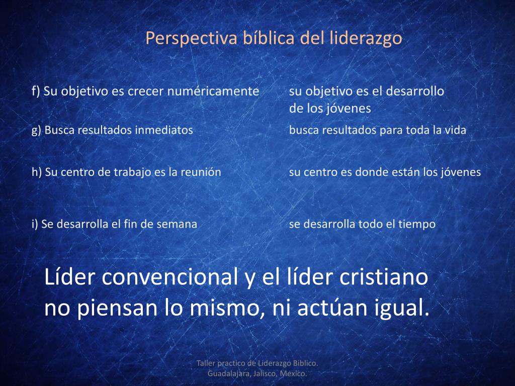 Perspectiva bíblica del liderazgo f) Su objetivo es crecer numéricamente su objetivo es el desarrollo de los jóvenes g) Busca resultados inmediatos busca resultados para toda la vida h) Su centro de trabajo es la reunión su centro es donde están los jóvenes i) Se desarrolla el fin de semana se desarrolla todo el tiempo Líder convencional y el líder cristiano no piensan lo mismo, ni actúan igual. Taller practico de Liderazgo Biblico. Guadalajara, Jalisco, Mexico.