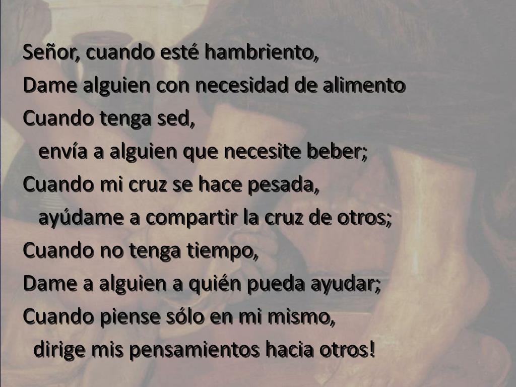 Señor, cuando esté hambriento, Dame alguien con necesidad de alimento Cuando tenga sed, envía a alguien que necesite beber; Cuando mi cruz se hace pesada, ayúdame a compartir la cruz de otros; Cuando no tenga tiempo, Dame a alguien a quién pueda ayudar; Cuando piense sólo en mi mismo, dirige mis pensamientos hacia otros!