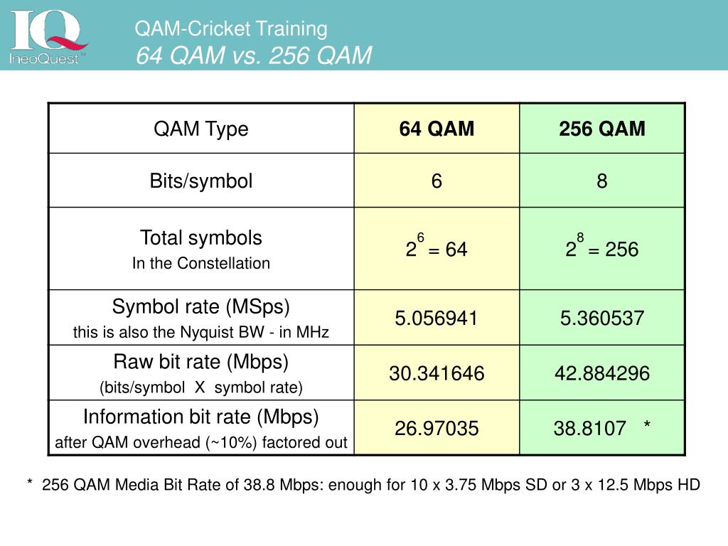 QAM-Cricket Training 64 QAM vs. 256 QAM * 256 QAM Media Bit Rate of 38.8 Mbps: enough for 10 x 3.75 Mbps SD or 3 x 12.5 Mbps HD