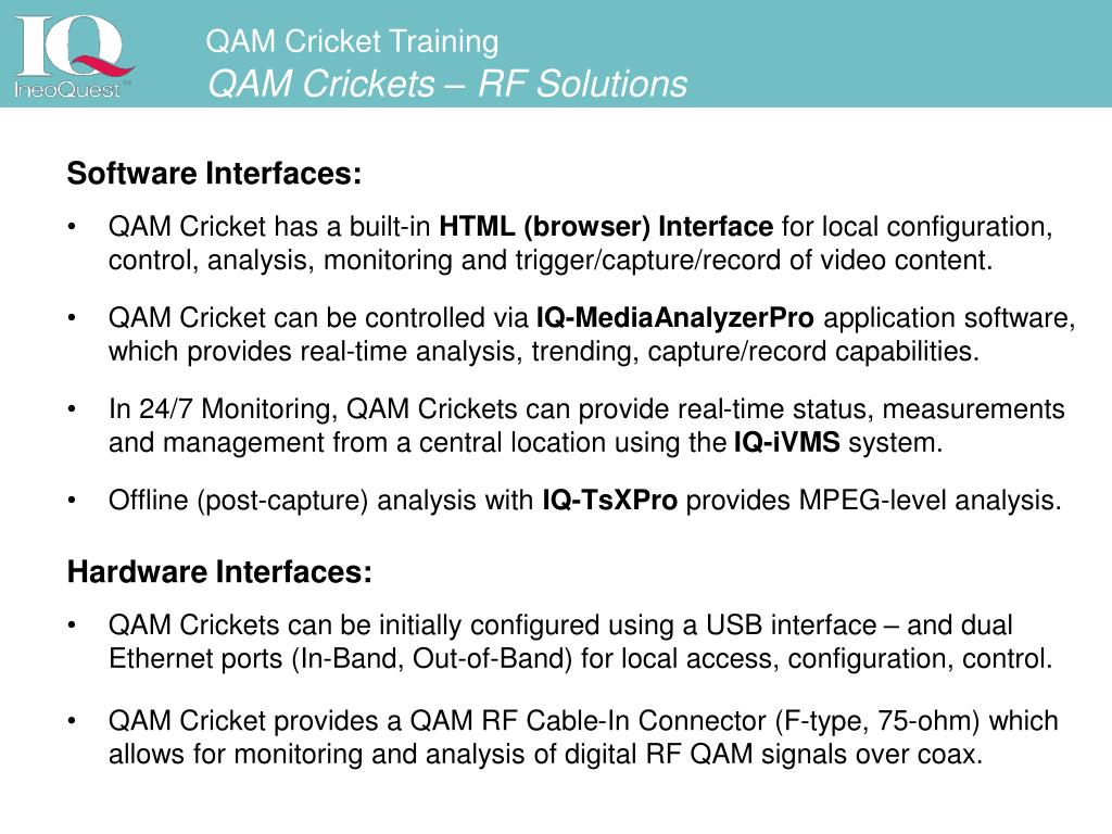 Software Interfaces: QAM Cricket has a built-in HTML (browser) Interface for local configuration, control, analysis, monitoring and trigger/capture/record of video content. QAM Cricket can be controlled via IQ-MediaAnalyzerPro application software, which provides real-time analysis, trending, capture/record capabilities. In 24/7 Monitoring, QAM Crickets can provide real-time status, measurements and management from a central location using the IQ-iVMS system. Offline (post-capture) analysis with IQ-TsXPro provides MPEG-level analysis. QAM Cricket TrainingQAM Crickets – RF Solutions • Hardware Interfaces: • QAM Crickets can be initially configured using a USB interface – and dual Ethernet ports (In-Band, Out-of-Band) for local access, configuration, control. • QAM Cricket provides a QAM RF Cable-In Connector (F-type, 75-ohm) which allows for monitoring and analysis of digital RF QAM signals over coax.