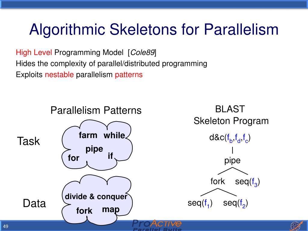 Algorithmic Skeletons for Parallelism • High Level Programming Model [Cole89] • Hides the complexity of parallel/distributed programming • Exploits nestable parallelism patterns BLAST Skeleton Program Parallelism Patterns farm while d&c(fb,fd,fc) Task pipe if for pipe fork seq(f3) divide & conquer seq(f2) seq(f1) Data map fork
