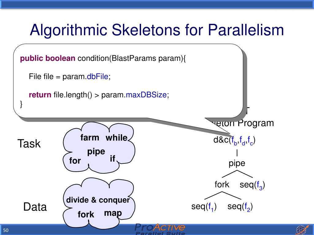 Algorithmic Skeletons for Parallelism publicboolean condition(BlastParams param){ File file = param.dbFile; return file.length() > param.maxDBSize; } • High Level Programming Model [Cole89] • Hides the complexity of parallel/distributed programming • Exploits nestable parallelism patterns BLAST Skeleton Program Parallelism Patterns farm while d&c(fb,fd,fc) Task pipe if for pipe fork seq(f3) divide & conquer seq(f2) seq(f1) Data map fork