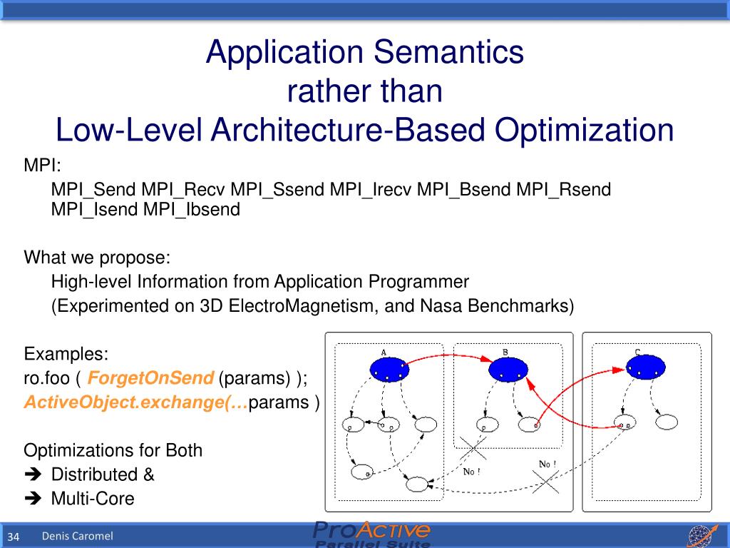 Application Semantics rather thanLow-Level Architecture-Based Optimization • MPI: • MPI_Send MPI_Recv MPI_Ssend MPI_Irecv MPI_Bsend MPI_Rsend MPI_Isend MPI_Ibsend • What we propose: • High-level Information from Application Programmer • (Experimented on 3D ElectroMagnetism, and Nasa Benchmarks) • Examples: • ro.foo ( ForgetOnSend (params) ); • ActiveObject.exchange(…params ); Optimizations for Both • Distributed & • Multi-Core Denis Caromel