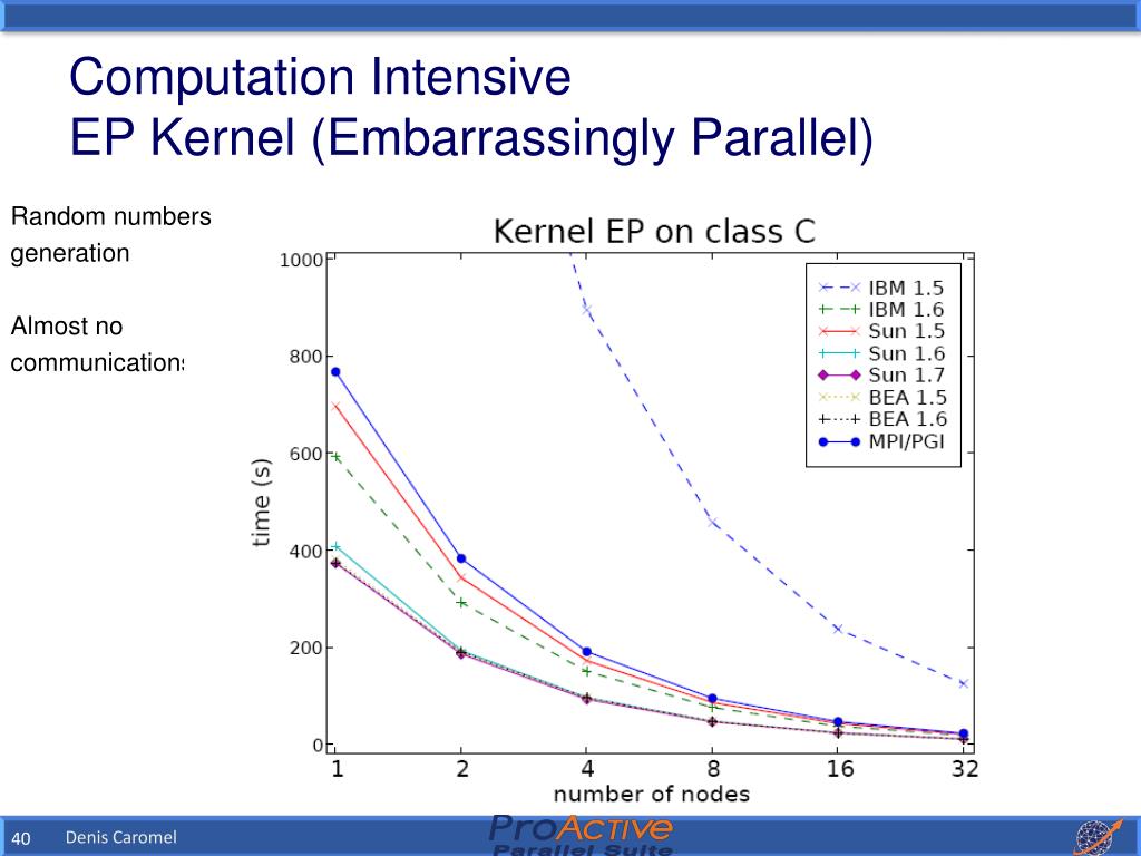 Computation IntensiveEP Kernel (Embarrassingly Parallel) • Random numbers • generation • Almost no • communications This is Java!!! Denis Caromel