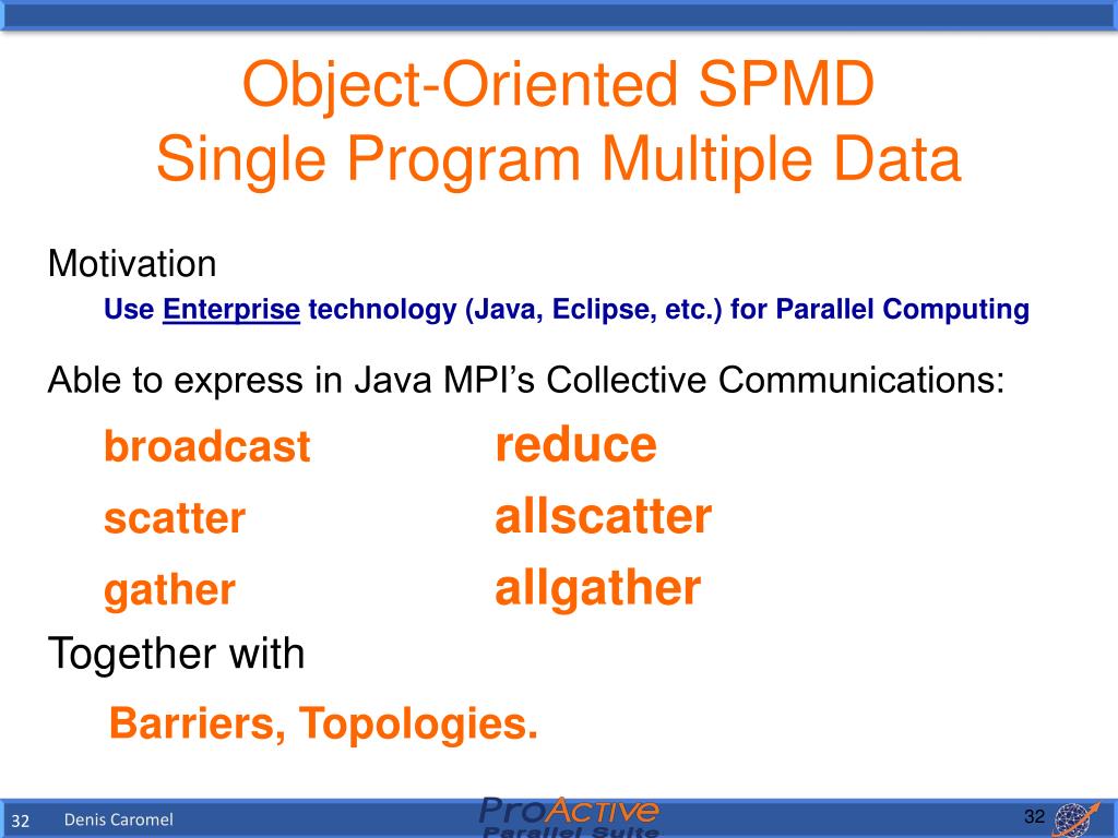 Object-Oriented SPMDSingle Program Multiple Data Motivation Use Enterprise technology (Java, Eclipse, etc.) for Parallel Computing Able to express in Java MPI’s Collective Communications: broadcast reduce scatter allscatter gather allgather Together with Barriers, Topologies. 32 Denis Caromel