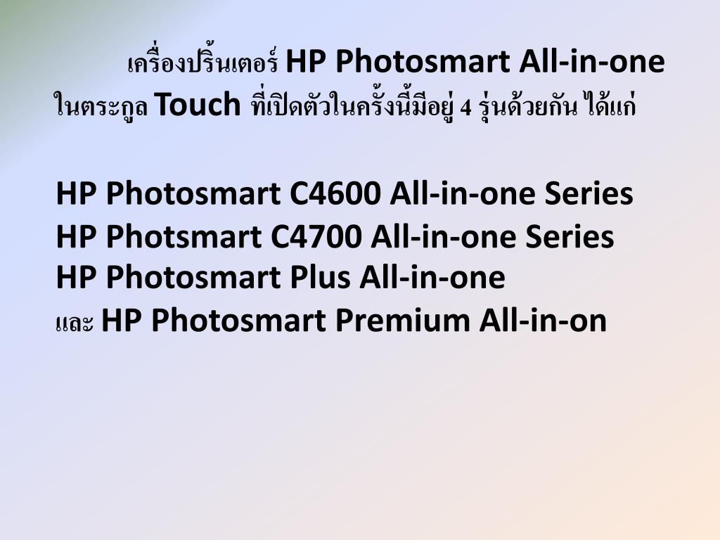 เครื่องปริ้นเตอร์HP Photosmart All-in-one ในตระกูล Touch ที่เปิดตัวในครั้งนี้มีอยู่ 4 รุ่นด้วยกัน ได้แก่ HP Photosmart C4600 All-in-one Series HP Photsmart C4700 All-in-one Series HP Photosmart Plus All-in-one และ HP Photosmart Premium All-in-on