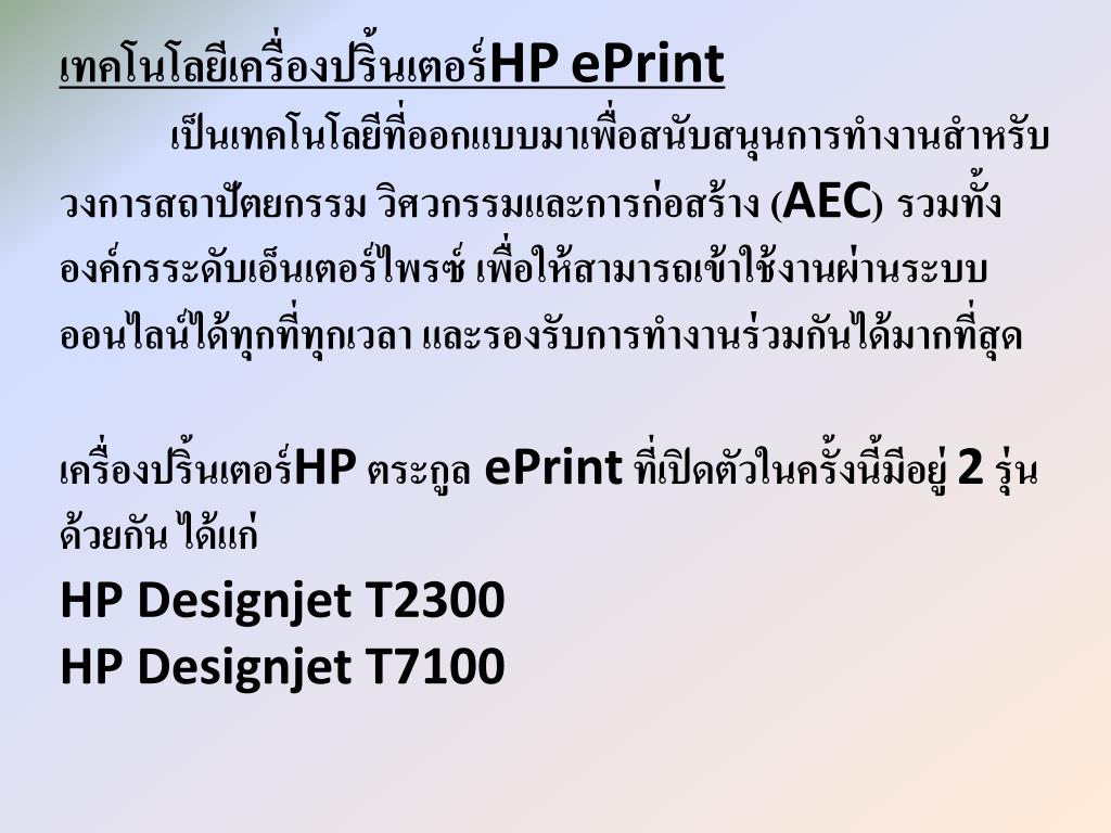 เทคโนโลยีเครื่องปริ้นเตอร์HPePrintเทคโนโลยีเครื่องปริ้นเตอร์HPePrint เป็นเทคโนโลยีที่ออกแบบมาเพื่อสนับสนุนการทำงานสำหรับวงการสถาปัตยกรรม วิศวกรรมและการก่อสร้าง (AEC)รวมทั้งองค์กรระดับเอ็นเตอร์ไพรซ์ เพื่อให้สามารถเข้าใช้งานผ่านระบบออนไลน์ได้ทุกที่ทุกเวลา และรองรับการทำงานร่วมกันได้มากที่สุด เครื่องปริ้นเตอร์HP ตระกูลePrint ที่เปิดตัวในครั้งนี้มีอยู่ 2 รุ่นด้วยกัน ได้แก่ HP Designjet T2300 HP Designjet T7100