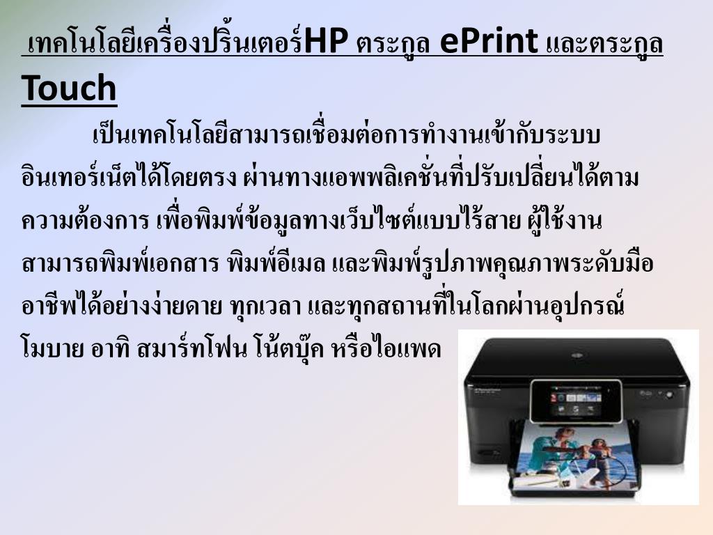 เทคโนโลยีเครื่องปริ้นเตอร์HP ตระกูลePrint และตระกูล Touch เป็นเทคโนโลยีสามารถเชื่อมต่อการทำงานเข้ากับระบบอินเทอร์เน็ตได้โดยตรง ผ่านทางแอพพลิเคชั่นที่ปรับเปลี่ยนได้ตามความต้องการ เพื่อพิมพ์ข้อมูลทางเว็บไซต์แบบไร้สาย ผู้ใช้งานสามารถพิมพ์เอกสาร พิมพ์อีเมล และพิมพ์รูปภาพคุณภาพระดับมืออาชีพได้อย่างง่ายดาย ทุกเวลา และทุกสถานที่ในโลกผ่านอุปกรณ์ โมบาย อาทิ สมาร์ทโฟนโน้ตบุ๊ค หรือไอแพด