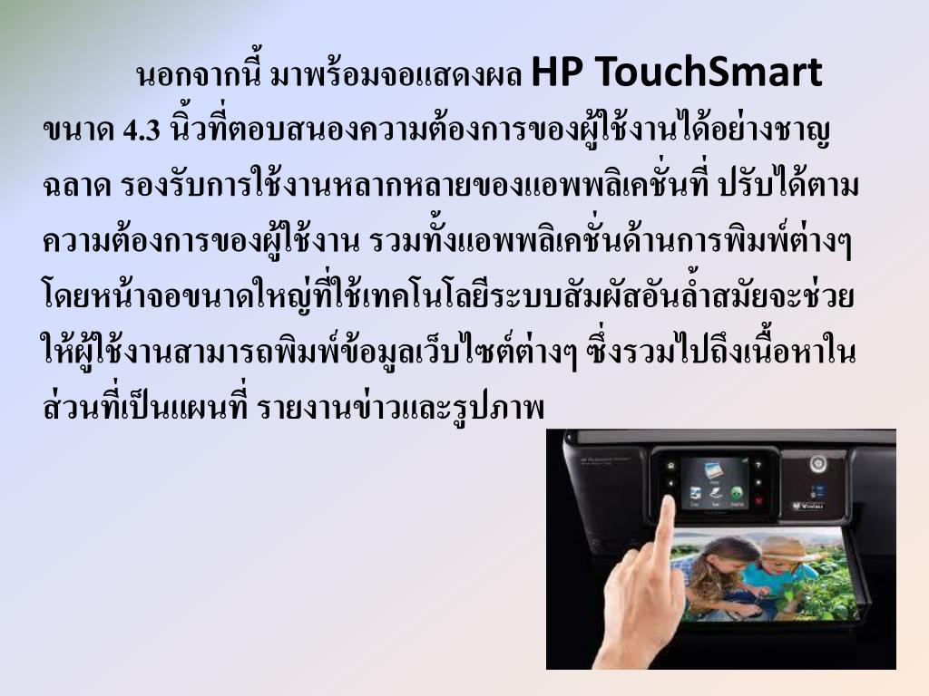 นอกจากนี้ มาพร้อมจอแสดงผล HP TouchSmartขนาด 4.3 นิ้วที่ตอบสนองความต้องการของผู้ใช้งานได้อย่างชาญฉลาด รองรับการใช้งานหลากหลายของแอพพลิเคชั่นที่ ปรับได้ตามความต้องการของผู้ใช้งาน รวมทั้งแอพพลิเคชั่นด้านการพิมพ์ต่างๆ โดยหน้าจอขนาดใหญ่ที่ใช้เทคโนโลยีระบบสัมผัสอันล้ำสมัยจะช่วยให้ผู้ใช้งานสามารถพิมพ์ข้อมูลเว็บไซต์ต่างๆ ซึ่งรวมไปถึงเนื้อหาในส่วนที่เป็นแผนที่ รายงานข่าวและรูปภาพ