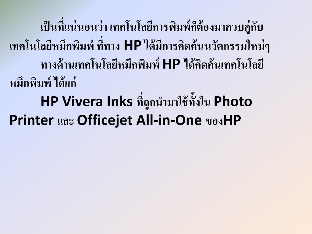 เป็นที่แน่นอนว่า เทคโนโลยีการพิมพ์ก็ต้องมาควบคู่กับเทคโนโลยีหมึกพิมพ์ ที่ทาง HP ได้มีการคิดค้นนวัตกรรมใหม่ๆ ทางด้านเทคโนโลยีหมึกพิมพ์ HP ได้คิดค้นเทคโนโลยี หมึกพิมพ์ ได้แก่ HP Vivera Inks ที่ถูกนำมาใช้ทั้งใน Photo Printer และ Officejet All-in-One ของHP