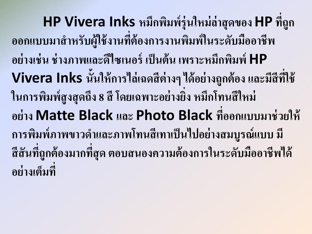 HP Vivera Inks หมึกพิมพ์รุ่นใหม่ล่าสุดของ HP ที่ถูกออกแบบมาสำหรับผู้ใช้งานที่ต้องการงานพิมพ์ในระดับมืออาชีพ อย่างเช่น ช่างภาพและดีไซเนอร์ เป็นต้น เพราะหมึกพิมพ์ HP Vivera Inks นั้นให้การไล่เฉดสีต่างๆ ได้อย่างถูกต้อง และมีสีที่ใช้ในการพิมพ์สูงสุดถึง 8 สี โดยเฉพาะอย่างยิ่ง หมึกโทนสีใหม่อย่าง Matte Black และ Photo Black ที่ออกแบบมาช่วยให้การพิมพ์ภาพขาวดำและภาพโทนสีเทาเป็นไปอย่างสมบูรณ์แบบ มีสีสันที่ถูกต้องมากที่สุด ตอบสนองความต้องการในระดับมืออาชีพได้อย่างเต็มที่
