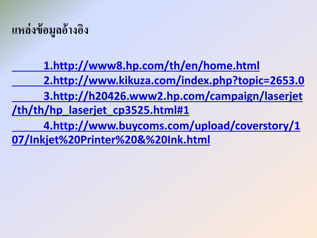 แหล่งข้อมูลอ้างอิง 1.http://www8.hp.com/th/en/home.html 2.http://www.kikuza.com/index.php?topic=2653.0 3.http://h20426.www2.hp.com/campaign/laserjet/th/th/hp_laserjet_cp3525.html#1 4.http://www.buycoms.com/upload/coverstory/107/Inkjet%20Printer%20&%20Ink.html