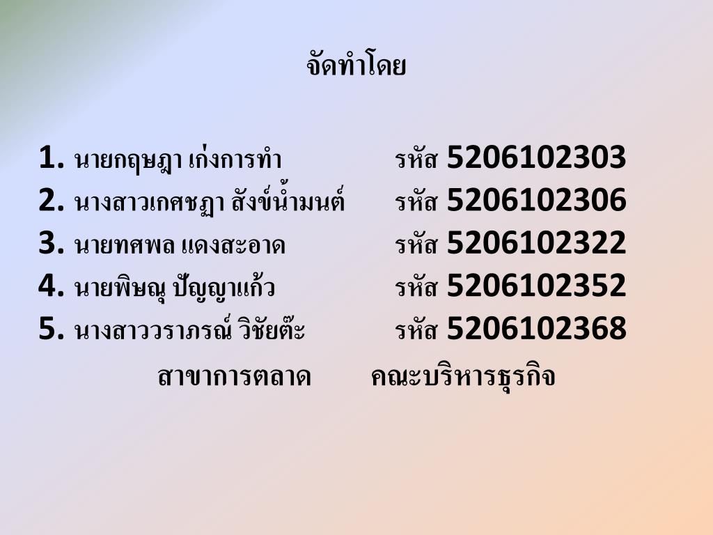 จัดทำโดย 1. นายกฤษฎา เก่งการทำ รหัส 5206102303 2. นางสาวเกศชฏา สังข์น้ำมนต์ รหัส 5206102306 3. นายทศพล แดงสะอาด รหัส 5206102322 4. นายพิษณุ ปัญญาแก้ว รหัส 5206102352 5. นางสาววราภรณ์วิชัยต๊ะ รหัส 5206102368 สาขาการตลาด คณะบริหารธุรกิจ