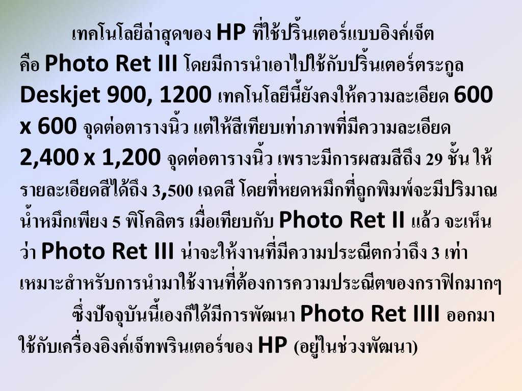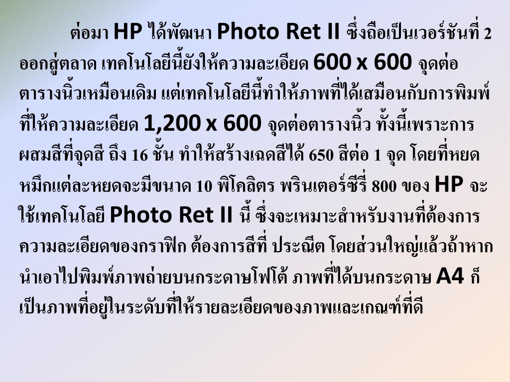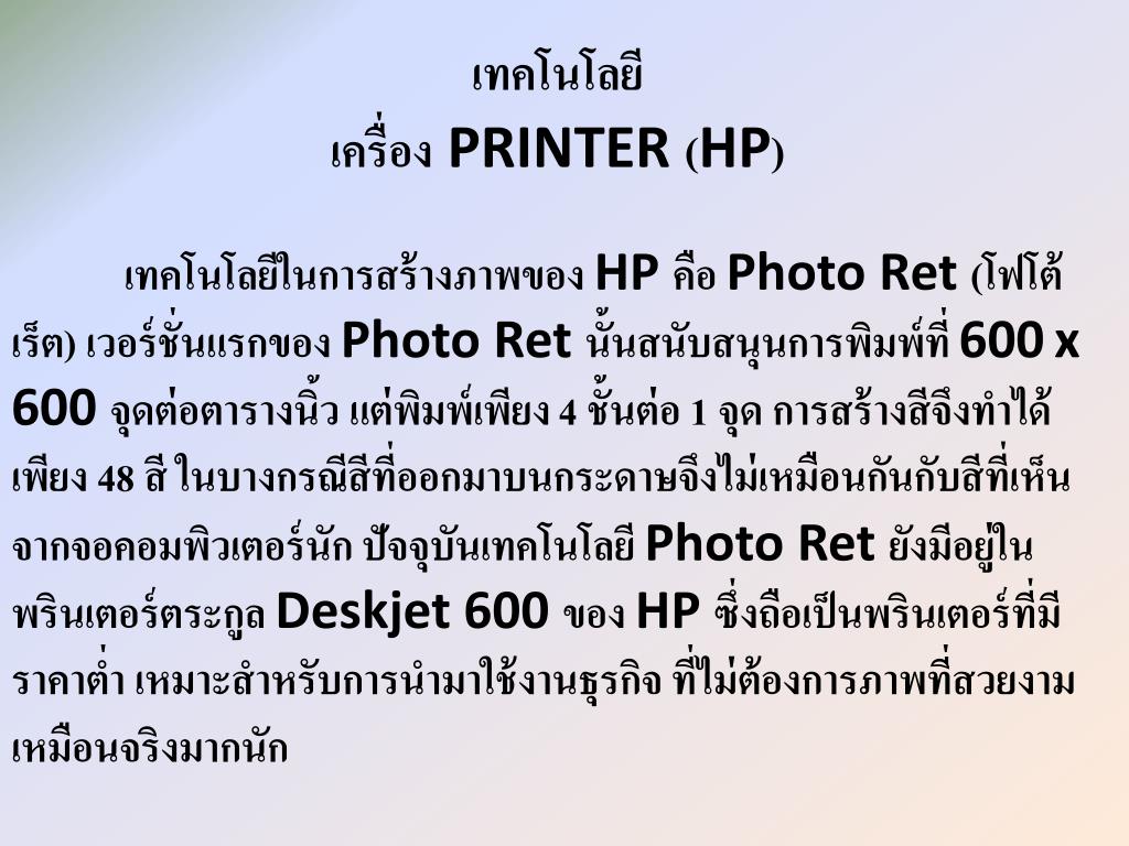 เทคโนโลยี เครื่อง PRINTER (HP) เทคโนโลยีในการสร้างภาพของ HP คือ Photo Ret (โฟโต้เร็ต) เวอร์ชั่นแรกของ Photo Ret นั้นสนับสนุนการพิมพ์ที่ 600x 600 จุดต่อตารางนิ้ว แต่พิมพ์เพียง 4 ชั้นต่อ 1 จุด การสร้างสีจึงทำได้เพียง 48 สี ในบางกรณีสีที่ออกมาบนกระดาษจึงไม่เหมือนกันกับสีที่เห็นจากจอคอมพิวเตอร์นัก ปัจจุบันเทคโนโลยี Photo Ret ยังมีอยู่ในพรินเตอร์ตระกูล Deskjet 600 ของ HP ซึ่งถือเป็นพรินเตอร์ที่มีราคาต่ำ เหมาะสำหรับการนำมาใช้งานธุรกิจ ที่ไม่ต้องการภาพที่สวยงามเหมือนจริงมากนัก