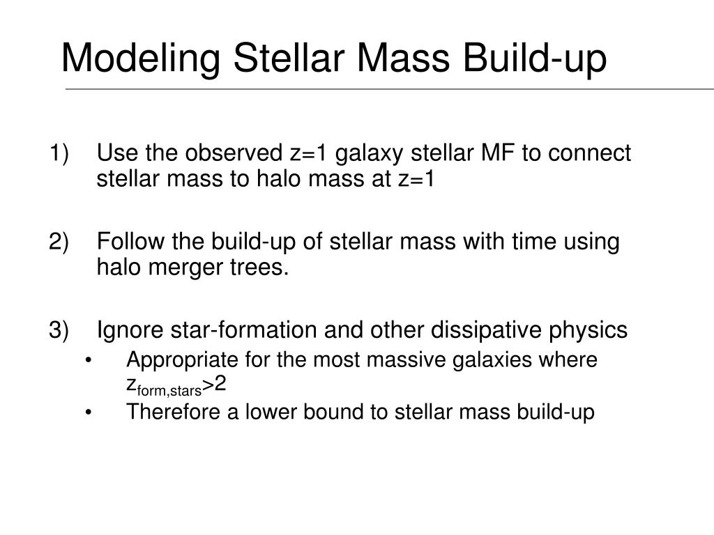 Modeling Stellar Mass Build-up • Use the observed z=1 galaxy stellar MF to connect stellar mass to halo mass at z=1 • Follow the build-up of stellar mass with time using halo merger trees. • Ignore star-formation and other dissipative physics • Appropriate for the most massive galaxies where zform,stars>2 • Therefore a lower bound to stellar mass build-up