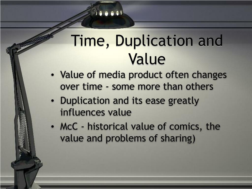 Time, Duplication and Value • Value of media product often changes over time - some more than others • Duplication and its ease greatly influences value • McC - historical value of comics, the value and problems of sharing)