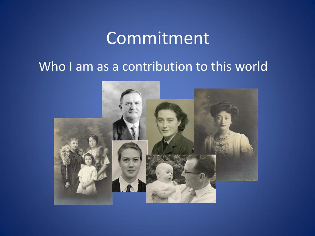 Commitment • Spend ten minutes on your own writing down aspects of yourself that provide glimpses into who God has made you to be as a contribution to this world. • Clues are: what you love to do and what you’re enthusiastic about. • Then find a partner and share with each other about who God has committed you to be.