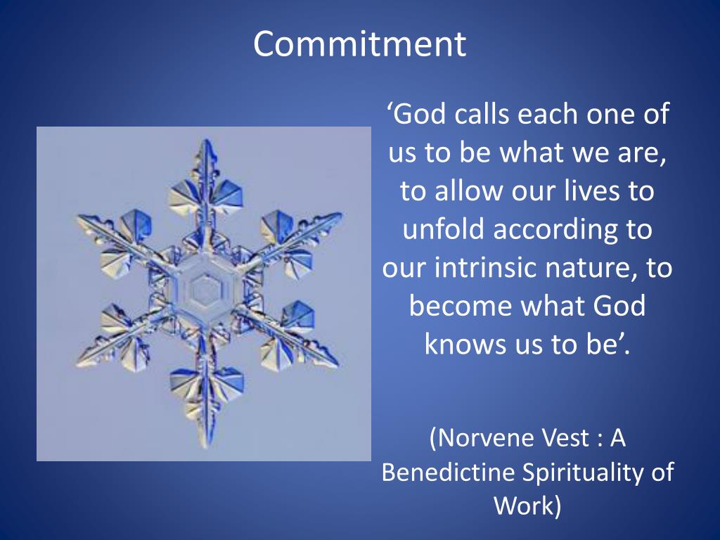 Commitment ‘God calls each one of us to be what we are, to allow our lives to unfold according to our intrinsic nature, to become what God knows us to be’. (Norvene Vest : A Benedictine Spirituality of Work)