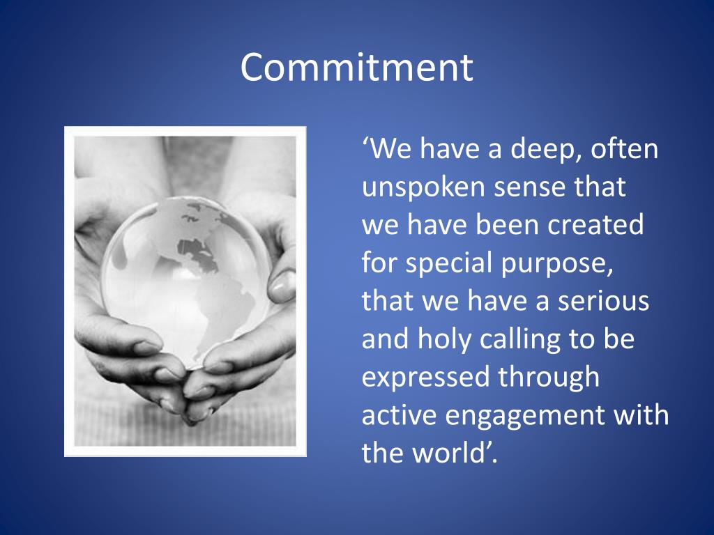 Commitment ‘We have a deep, often unspoken sense that we have been created for special purpose, that we have a serious and holy calling to be expressed through active engagement with the world’.