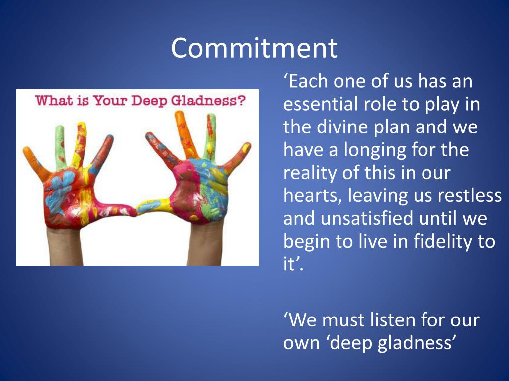 Commitment ‘Each one of us has an essential role to play in the divine plan and we have a longing for the reality of this in our hearts, leaving us restless and unsatisfied until we begin to live in fidelity to it’. ‘We must listen for our own ‘deep gladness’