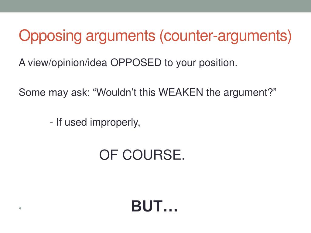 Opposing arguments (counter-arguments) A view/opinion/idea OPPOSED to your position. Some may ask: “Wouldn’t this WEAKEN the argument?” - If used improperly, OF COURSE. • BUT…