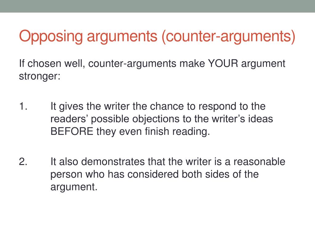 Opposing arguments (counter-arguments) If chosen well, counter-arguments make YOUR argument stronger: 1. It gives the writer the chance to respond to the readers’ possible objections to the writer’s ideas BEFORE they even finish reading. 2. It also demonstrates that the writer is a reasonable person who has considered both sides of the argument.