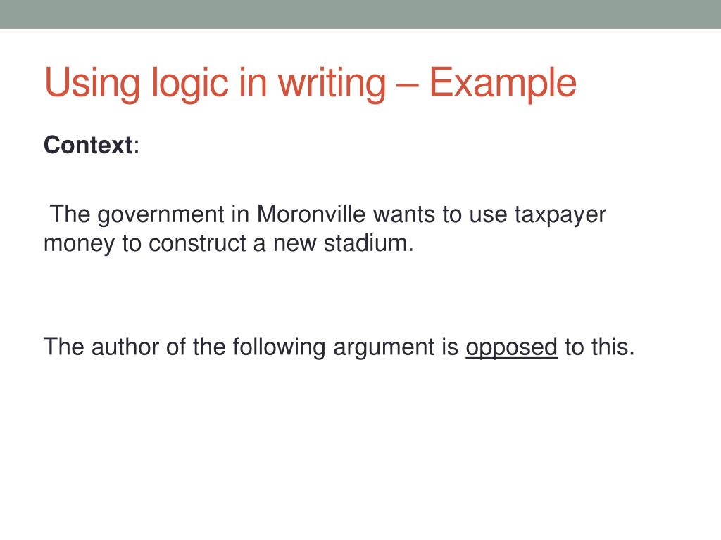 Using logic in writing – Example 1 Author’s logic: Premise 1: Projects funded by taxpayer dollars should benefit a majority of the public. Premise 2: The proposed stadium constructions benefits very few members of the public. Conclusion: Therefore, the stadium construction should not be funded by taxpayer dollars. This conclusion is logical. However, if there is no elaboration, it may not be persuasive to the audience.