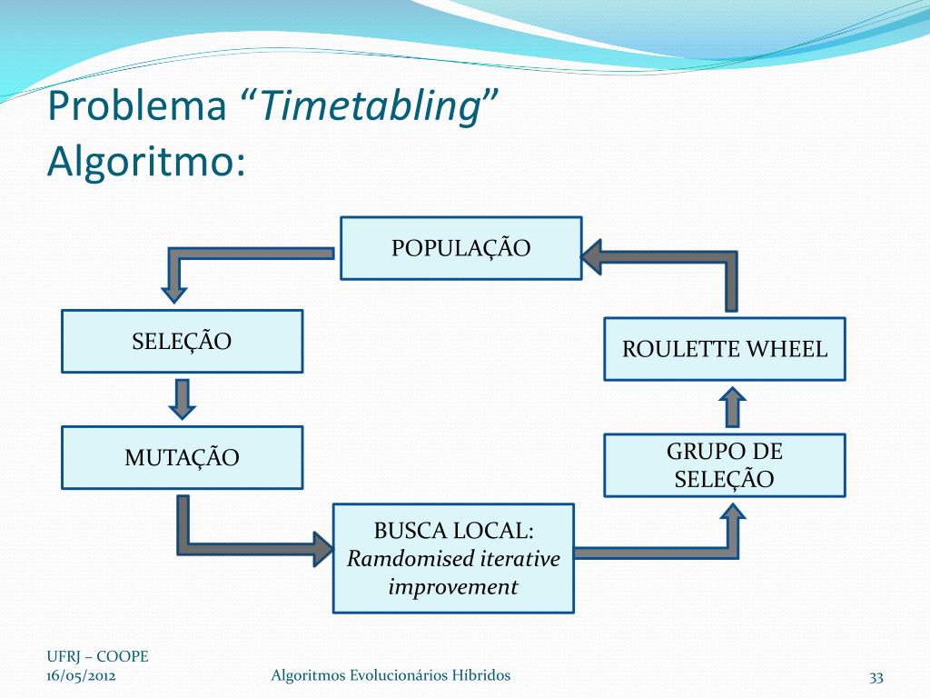 Problema “Timetabling”Algoritmo: POPULAÇÃO SELEÇÃO ROULETTE WHEEL MUTAÇÃO GRUPO DE SELEÇÃO BUSCA LOCAL: Ramdomisediterativeimprovement Algoritmos Evolucionários Híbridos