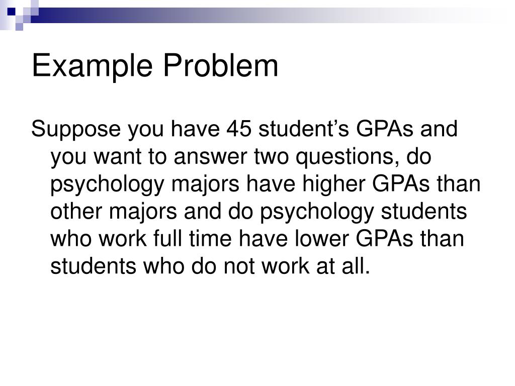 Example Problem Suppose you have 45 student’s GPAs and you want to answer two questions, do psychology majors have higher GPAs than other majors and do psychology students who work full time have lower GPAs than students who do not work at all.