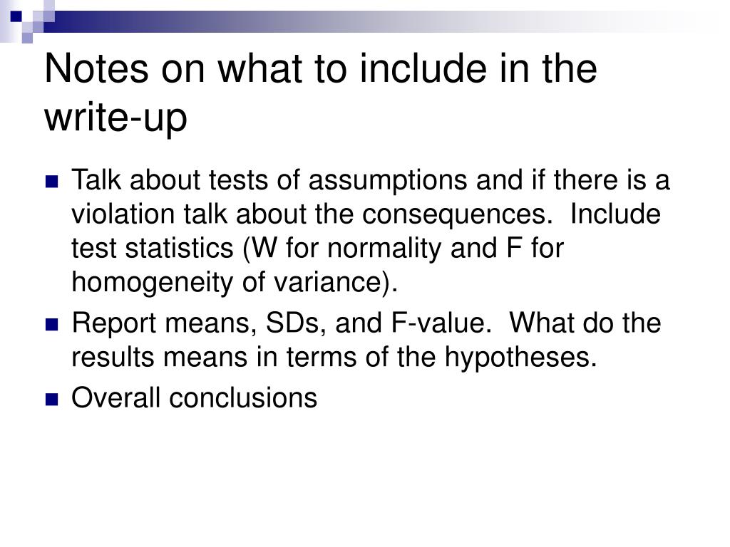 Notes on what to include in the write-up • Talk about tests of assumptions and if there is a violation talk about the consequences. Include test statistics (W for normality and F for homogeneity of variance). • Report means, SDs, and F-value. What do the results means in terms of the hypotheses. • Overall conclusions