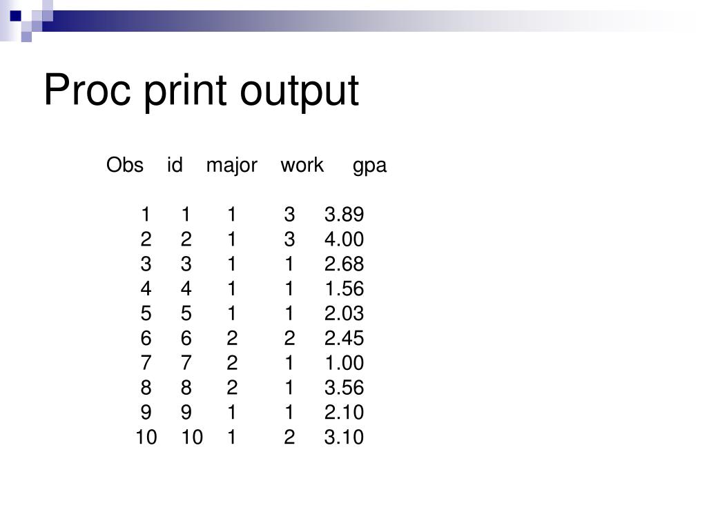 Proc print output Obs id major work gpa 1 1 1 3 3.89 2 2 1 3 4.00 3 3 1 1 2.68 4 4 1 1 1.56 5 5 1 1 2.03 6 6 2 2 2.45 7 7 2 1 1.00 8 8 2 1 3.56 9 9 1 1 2.10 10 10 1 2 3.10