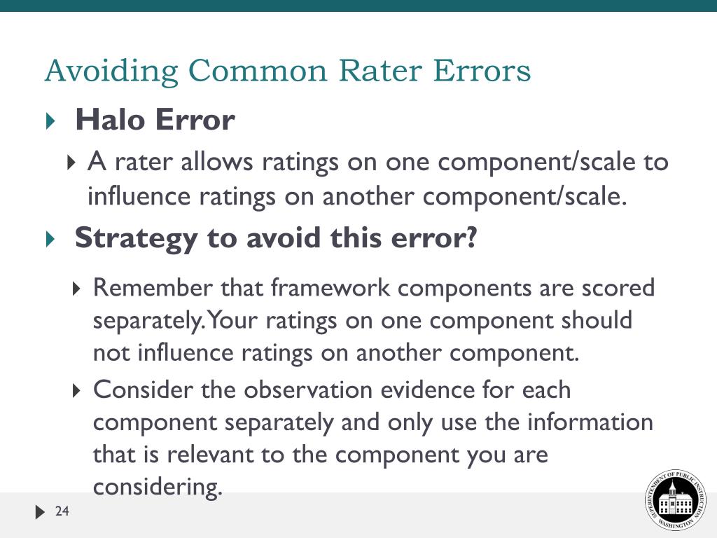 Avoiding Common Rater Errors • Halo Error • A rater allows ratings on one component/scale to influence ratings on another component/scale. • Strategy to avoid this error? • Remember that framework components are scored separately. Your ratings on one component should not influence ratings on another component. • Consider the observation evidence for each component separately and only use the information that is relevant to the component you are considering.